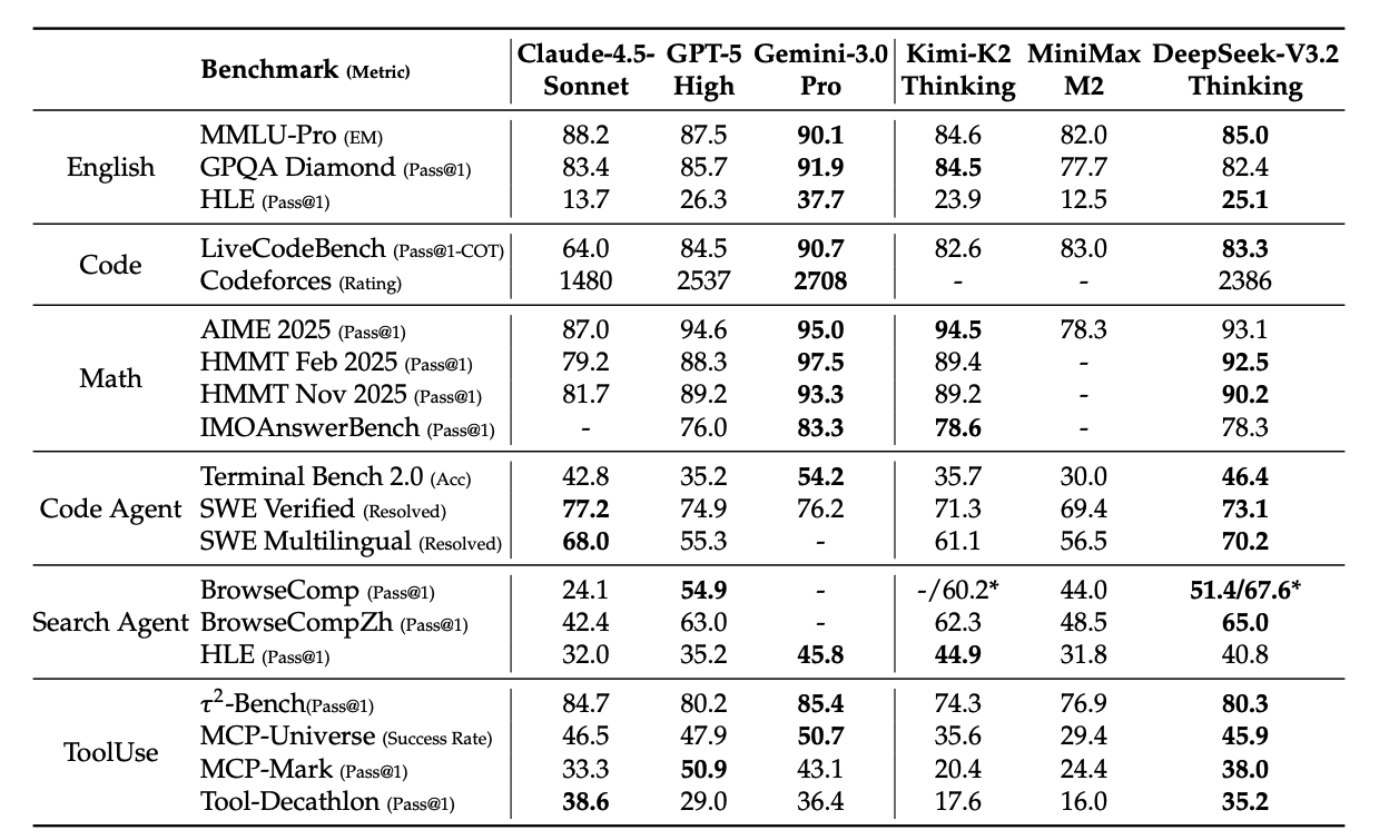 Fig. 1. Benchmark of DeepSeek-V3.2 and its counterparts. (Image source: DeepSeek-AI, 2025)
