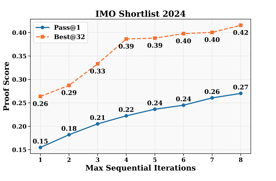 Fig. 11. Proof Quality Improves with Increasing Sequential Self-Refinement Iterations (1–8). (Image source: Shao et al., 2025)