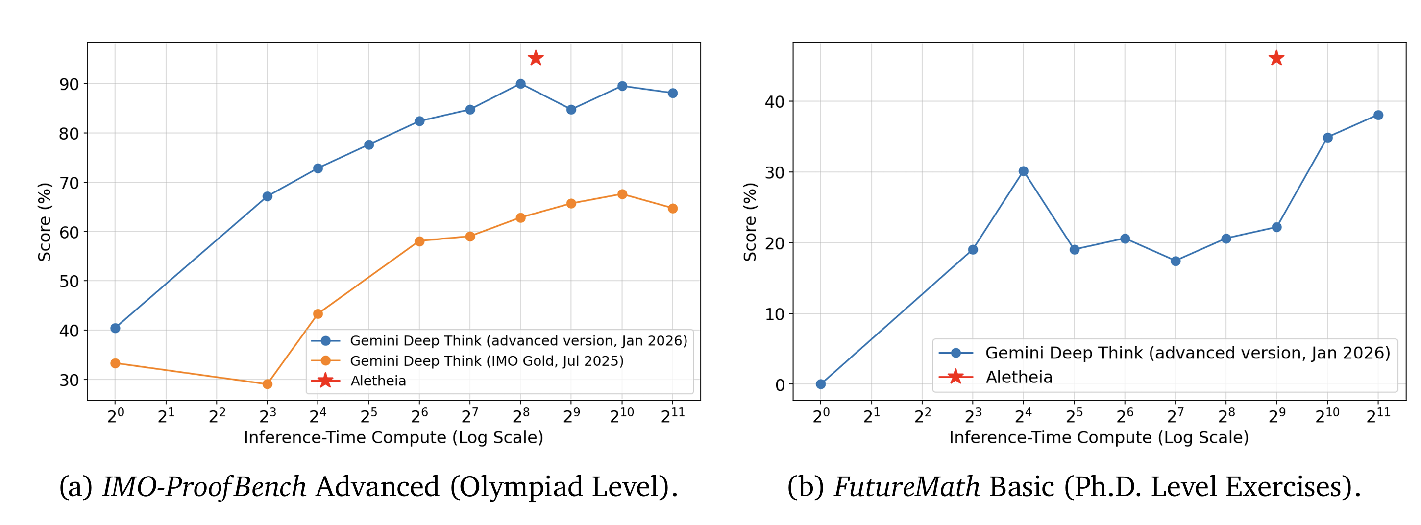 Fig. 9. The January 2026 Deep Think surpasses IMO-Gold on Olympiad problems, scales to PhD-level tasks, and, with Aletheia, delivers stronger reasoning at lower compute. (Image source: Feng et al., 2026)