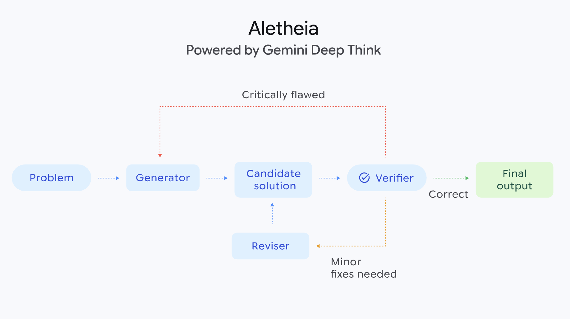 Fig. 8. Overview of Aletheia, a math research agent powered by Deep Think. It iteratively generates, verifies, and revises solutions. (Image source: Luong & Mirrokni, 2026)