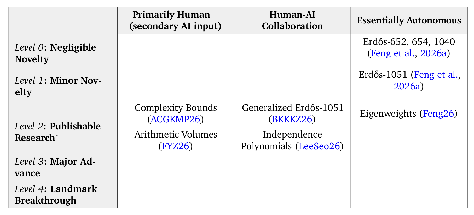 Fig. 10. The work proposes a taxonomy for AI-assisted mathematics based on research significance and AI contribution, reports several Level 0–2 results with Level 2 papers submitted to journals, and currently claims no Level 3 or 4 breakthroughs. (Image source: Feng et al., 2026)
