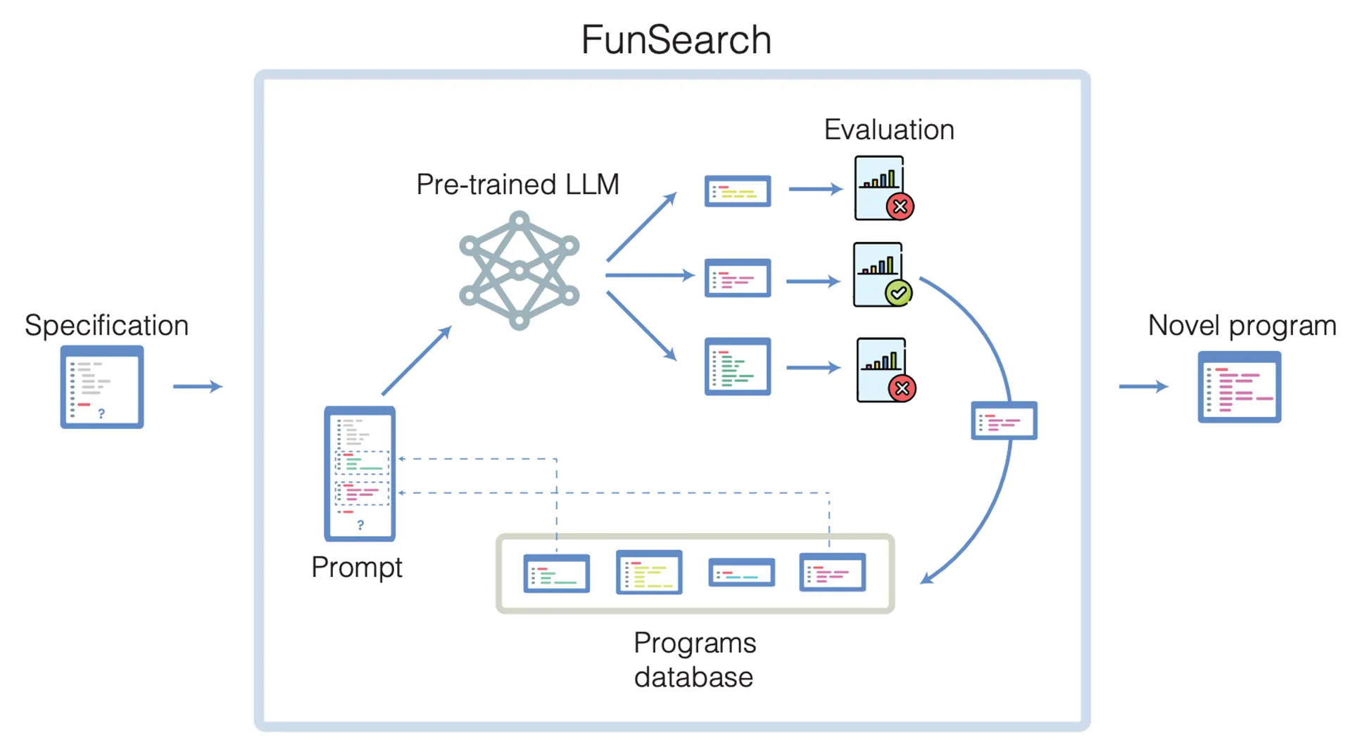 Fig. 2. The overview of FunSearch. (Image source: Romera-Paredes et al., 2024)