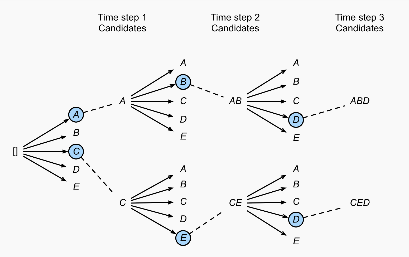 或束宽度) 最可能的候选序列 (称为“束”)。在下一步,它会基于这 $k$ 个序列扩展,并再次选出总概率最高的 $k$ 个新序列。最后,算法会从所有完成的候选序列中选择一个整体概率最高的作为最终输出。