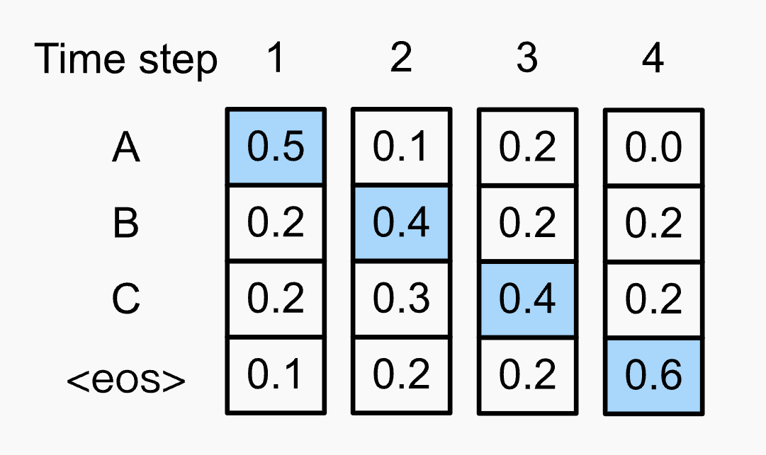 Fig. 3. At each time step, greedy search selects the token with the highest conditional probability. (Image source: d2l-en, 2019)