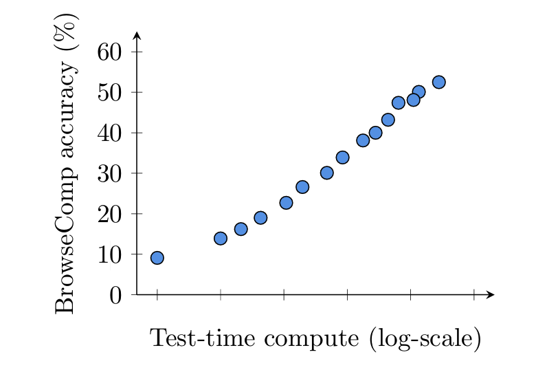 Fig. 4. BrowseComp performance of an early version of OpenAI Deep Research scales smoothly with test-time compute. (Image source: Wei et al., 2025)