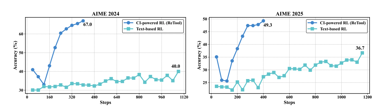 Fig. 20. AIME 2024 & 2025 scores of ReTool and text-based RL baseline on the Qwen2.5-32B-Instruct model. (Image source: Luo et al., 2025)