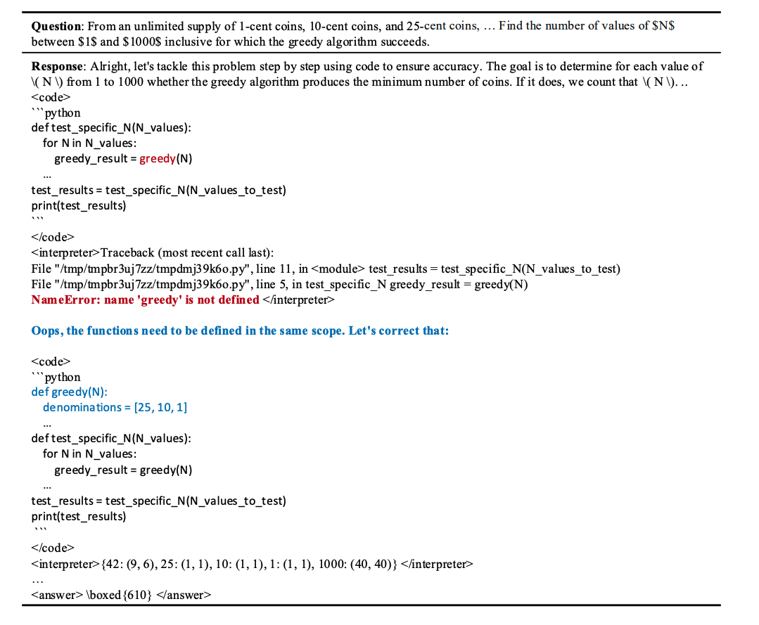 代码片段,这些代码会在沙盒环境(如 SandboxFusion)中执行,执行结果(包括输出或错误栈)会被包裹在<interpreter>...</interpreter>