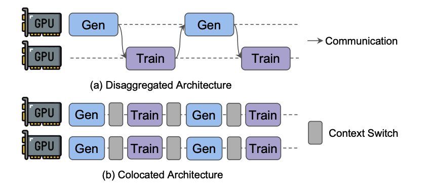 - 时分共用 (Colocate):将 Rollout 和 Training 部署在同一组 GPU 上,通过时间片轮流执行。这种方式实现简单,通信开销小,但稳定性差,且无法利用异构硬件。