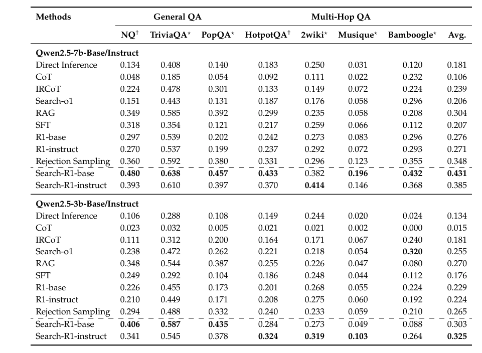 Fig. 17. The main results comparing SEARCH-R1 with baseline methods across the seven datasets. (Image source: Jin et al., 2025)