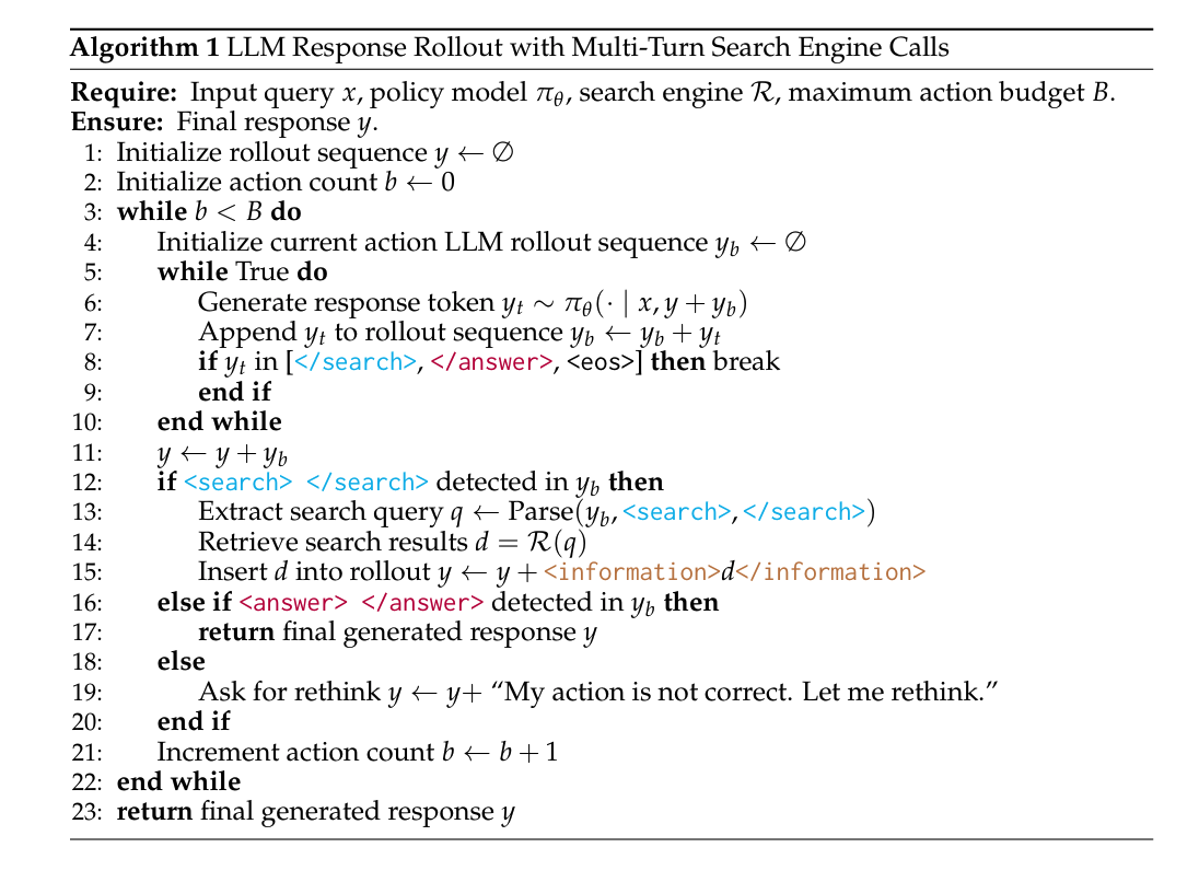Fig. 15. LLM Response Rollout with Multi-Turn Search Engine Calls. (Image source: Jin et al., 2025)