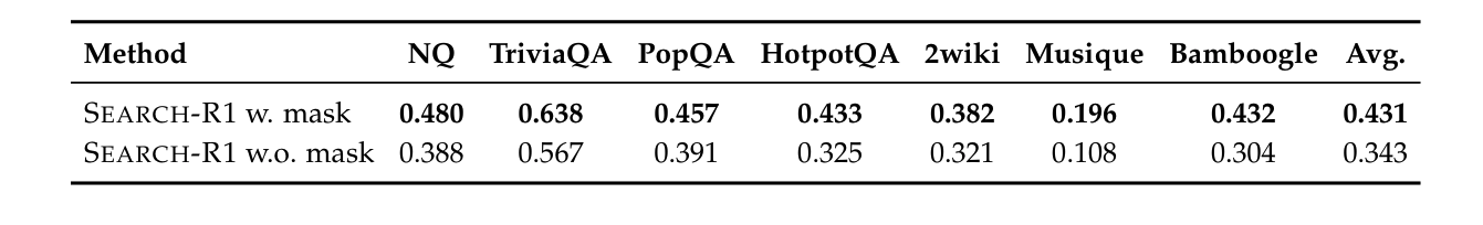 标签内的 retrieved token 均被masking,其损失不参与梯度更新。这一设计使模型专注于学习何时及如何进行推理和搜索,而非机械模仿外部检索内容,从而有效避免训练不稳定。下图结果显示使用该策略训练后的模型(Qwen2.5-7b-base,经 PPO 训练)在性能上始终优于未使用掩码的版本。