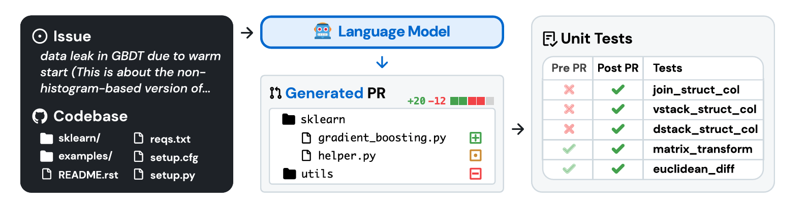 Fig. 3. SWE-bench links real GitHub issues with their merged pull request fixes. Given an issue description and a codebase snapshot, models generate a patch that is tested against actual project test cases. (Image source: Jimenez et al., 2024)
