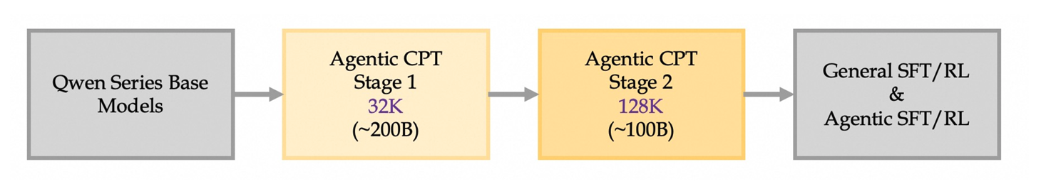 - Agentic CPT:在通用基础模型之上,利用大规模、多样化的合成智能体行为数据,继续进行“下一个词预测”式训练。其目标并非解决具体任务,而是让模型内化通用的 Agent 行为模式,形成 agentic 能力。