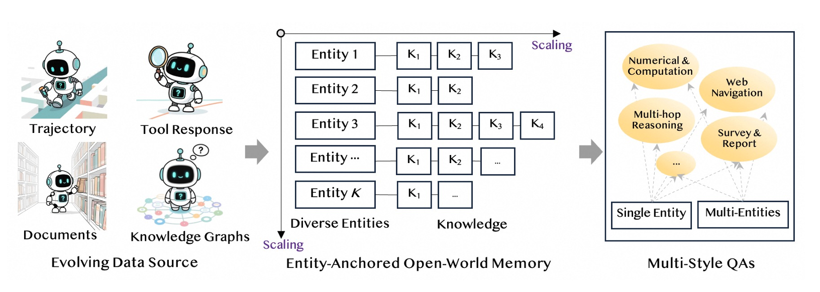 高质量的数据是训练强大智能体的基石。然而,人工标注 agent 在复杂任务中的完整决策轨迹成本极高且难以规模化。因此,合成数据成为了该领域的主流解决方案。各种创新的数据生成管线被提出,旨在构建一个能持续产生高质量训练数据的“数据飞轮”。