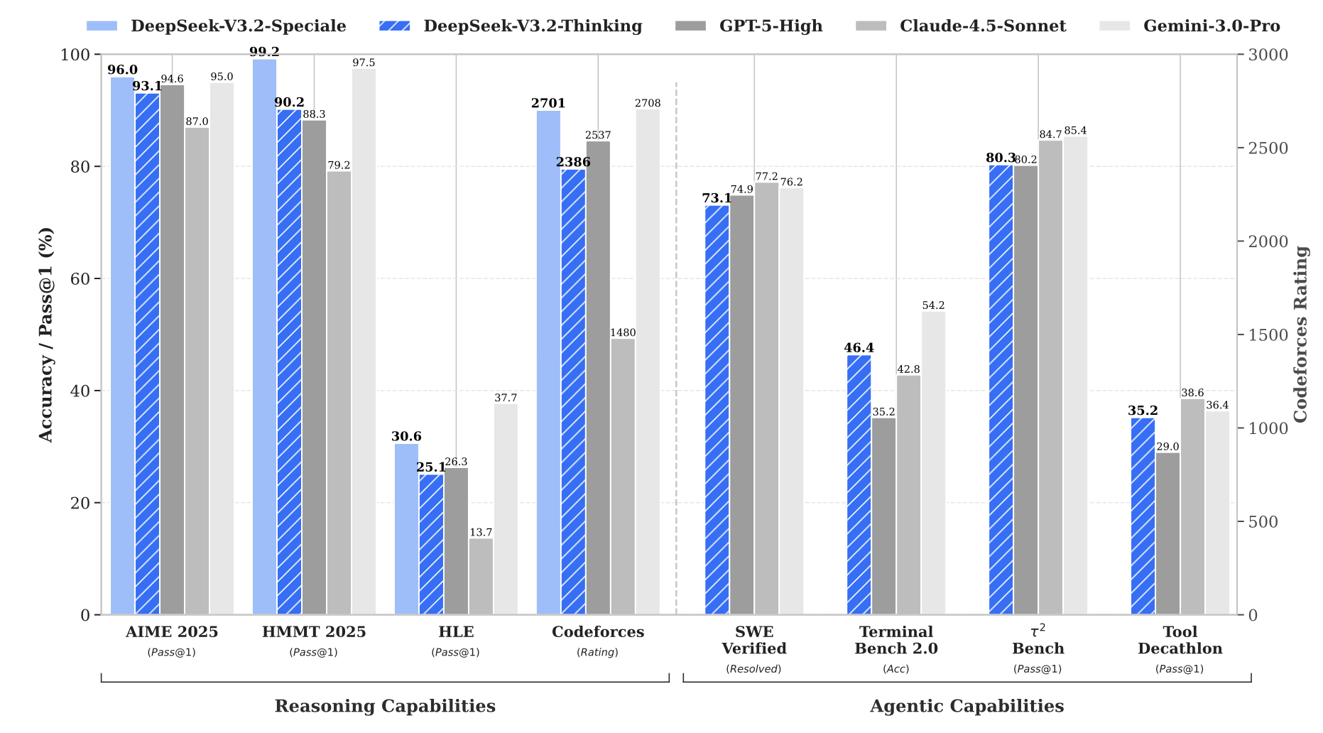Fig. 1. Benchmark of DeepSeek-V3.2 and its counterparts. (Image source: DeepSeek-AI, 2025)