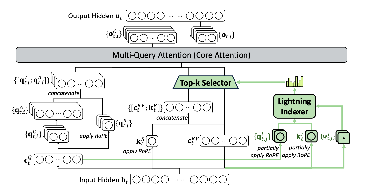 Fig. 2. Attention architecture of DeepSeek-V3.2, where DSA is instantiated under MLA. (Image source: DeepSeek-AI, 2025)