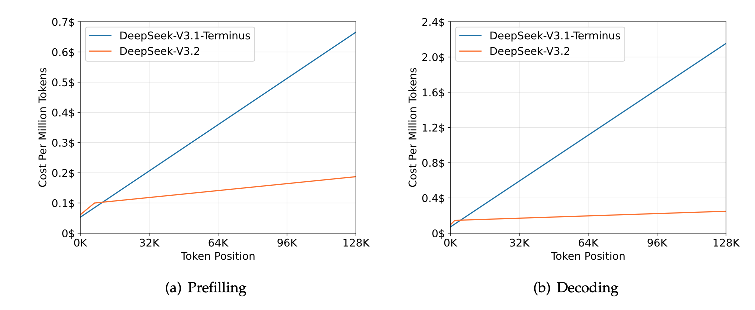 Fig. 3. Inference costs of DeepSeek-V3.1-Terminus and DeepSeek-V3.2 on H800 clusters. (Image source: DeepSeek-AI, 2025)