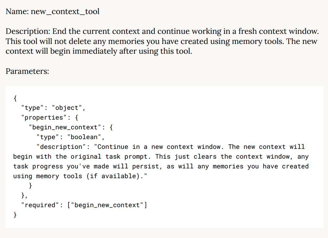 - Discard-all(完全重置):丢弃所有先前的工具调用历史以彻底重置上下文(机制类似于 Anthropic 的 new context tool)。