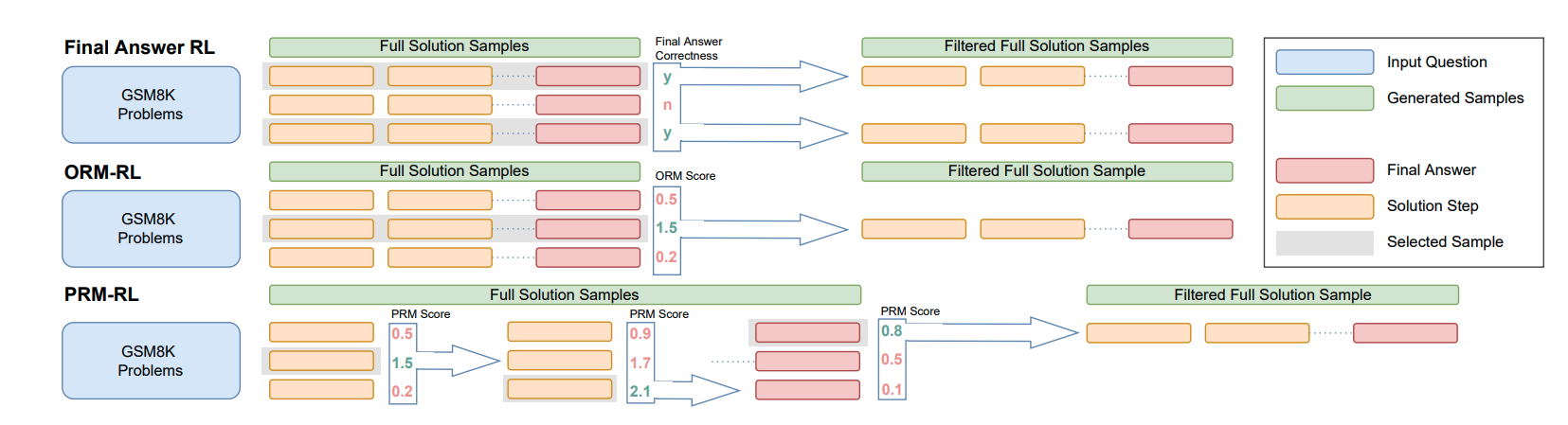 Fig. 9. Comparison of policy improvement mechanisms for Final-Answer RL, ORM-RL, and PRM-RL. (Image source: Uesato et al., 2022)
