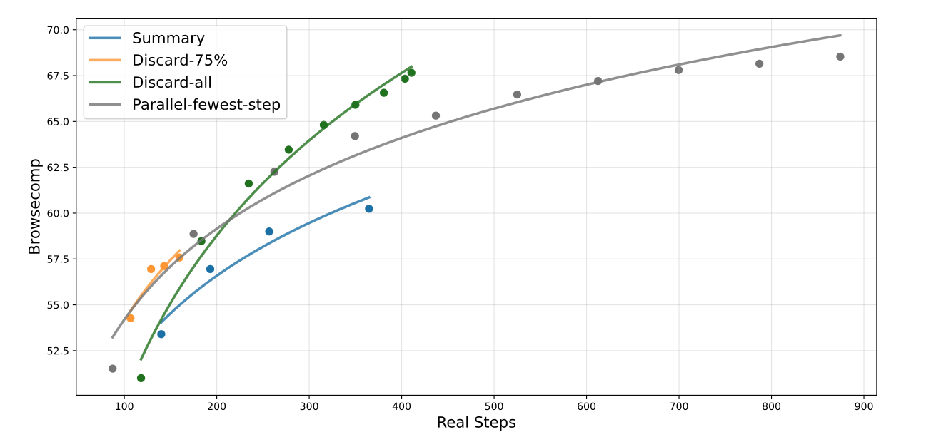 虽然 Summary 策略通过将平均步数从 140 延长至 364,成功将得分从 53.4 提升至 60.2,但其整体计算效率相对较低。 Discard-all 策略则在效率和可扩展性方面表现最佳,达到了 67.6 的高分。值得注意的是,它在性能上与并行扩展(Parallel scaling)基线相当,但所需的执行步数显著更少。