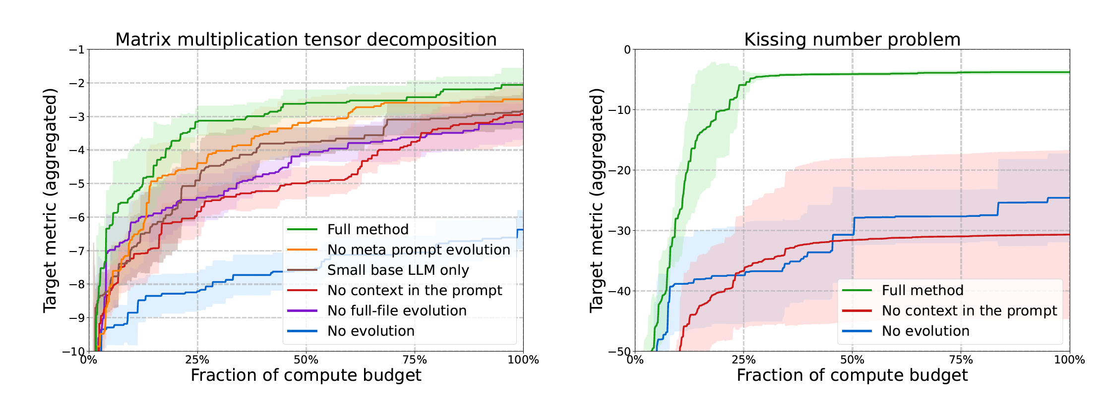 Fig. 5. AlphaEvolve ablation results on matrix multiplication tensor decomposition and Kissing. (Image source: Novikov et al., 2025)