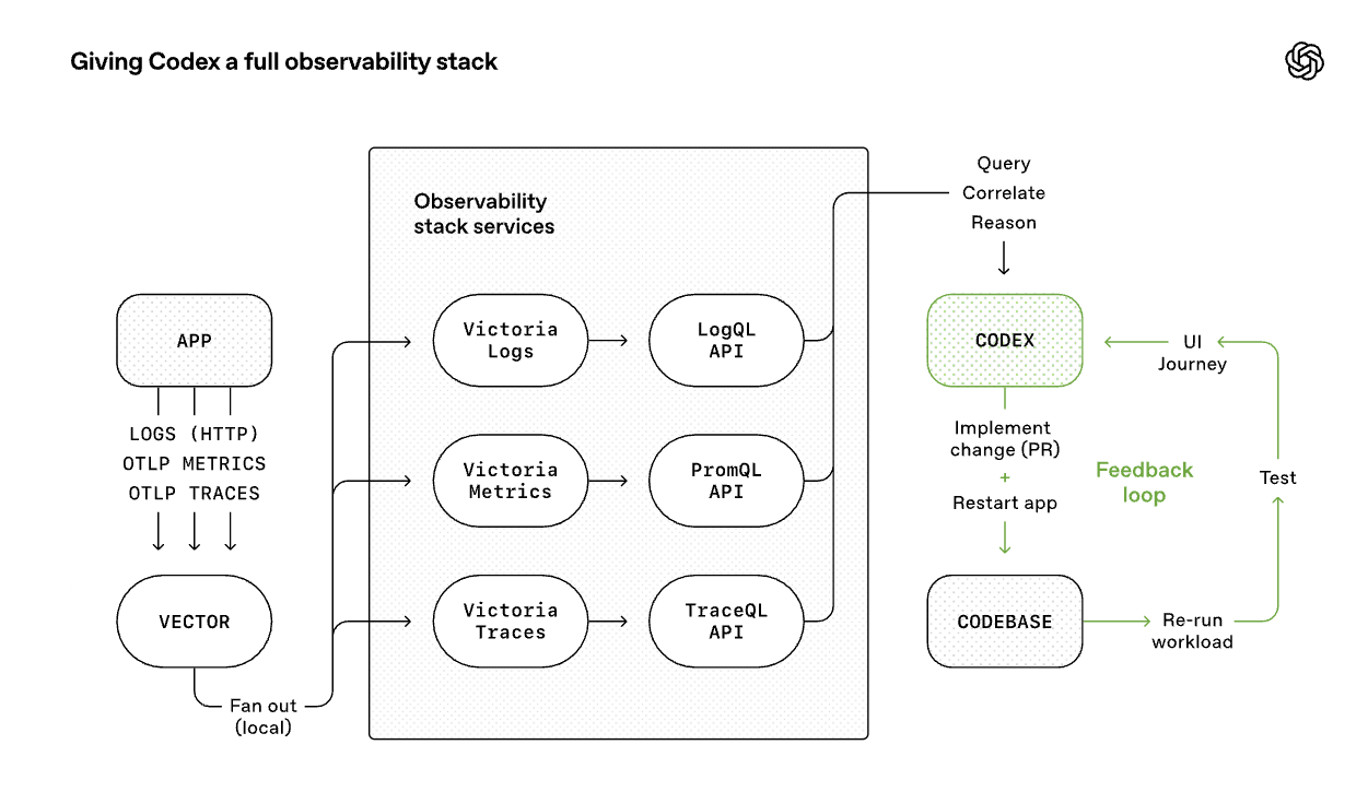 Fig. 6. Codex operating with a local, ephemeral observability stack—querying logs, metrics, and traces to validate fixes and iterate in a closed feedback loop. (Image source: OpenAI, 2026)